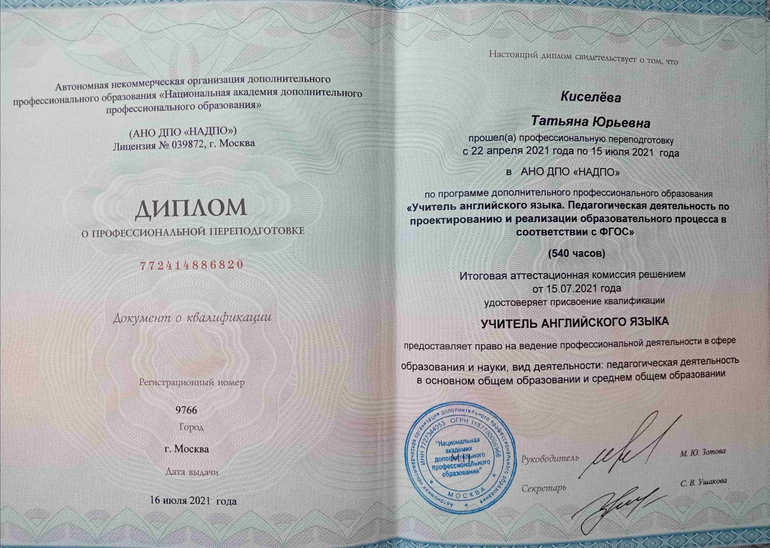 Переподготовка по программе «Учитель английского языка. Педагогическая деятельность по проектированию и